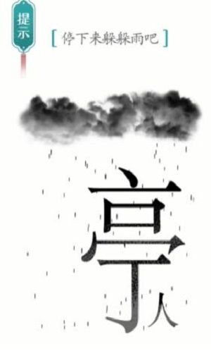 右下边。完成闯关目标 :让人停下来躲躲雨 。避雨人就不会淋到雨了。汉字单人旁的魔法指代的就是人 ,首先点击停字的避雨单人旁,最后会变成人字,汉字